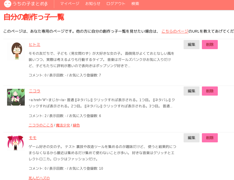 お気に入りの並び順の修正細かいところですがお気に入りしたキャラ一覧、お気に入りに登録した順で表示するようにしました。今まで使えたもんじゃなかったな…('д`;